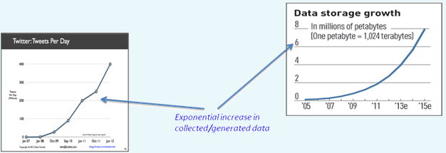 The main characteristic that makes data "big" is the sheer volume. It makes no sense to focus on minimum storage units because the total amount of information is growing exponentially every year. In 2010, Thomson Reuters estimated in its annual report that it believed the world was "awash with over 800 exabytes of data and growing."