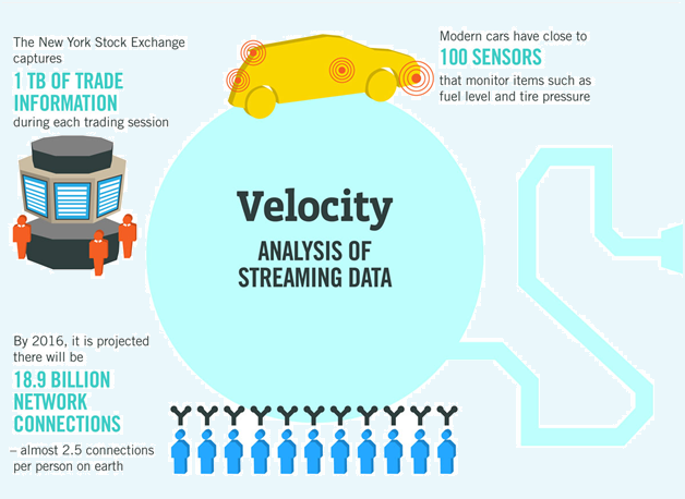 Velocity is the frequency of incoming data that needs to be processed. Think about how many SMS messages, Facebook status updates, or credit card swipes are being sent on a particular telecom carrier every minute of every day, and you'll have a good appreciation of velocity. A streaming application like Amazon Web Services Kinesis is an example of an application that handles the velocity of data.