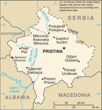 centered on a dark blue field is the geographical shape of Kosovo in a gold color surmounted by six white, five-pointed stars arrayed in a slight arc; each star represents one of the major ethnic groups of Kosovo: Albanians, Serbs, Turks, Gorani, Roma, and Bosniaks