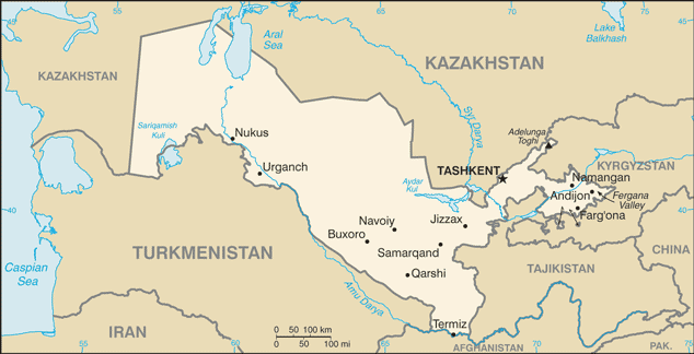 three equal horizontal bands of blue (top), white, and green separated by red fimbriations with a white crescent moon (closed side to the hoist) and 12 white stars shifted to the hoist on the top band; blue is the color of the Turkic peoples and of the sky, white signifies peace and the striving for purity in thoughts and deeds, while green represents nature and is the color of Islam; the red stripes are the vital force of all living organisms that links good and pure ideas with the eternal sky and with deeds on earth; the crescent represents Islam and the 12 stars the months and constellations of the Uzbek calendar
